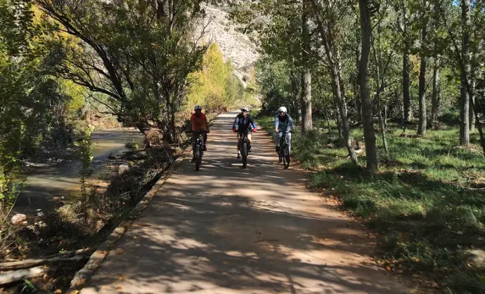 Recorreremos en bicicleta eléctrica la ribera del Río Martín a su paso por Oliete, visitando algunos de sus tesoros como los olivares recuperados de Apadrinaunolivo.org, el embalse de Cueva Foradada, las pinturas rupestres del Frontón de la Tía Chula o el Santuario Solar Prehistórico. Esta experiencia está guiada por la empresa de turismo activo Geoventur, especializada en actividades que combinan naturaleza, cultura y aventura.